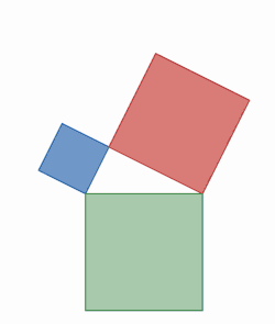 Another by rearrangement is given by the middle animation. A large square is formed with area c2, from four identical right triangles with sides a, b and c, fitted around a small central square. Then two rectangles are formed with sides a and b by moving the triangles. Combining the smaller square with these rectangles produces two squares of areas a2 and b2, which must have the same area as the initial large square.[40]