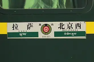 Line Z21/Z22 serves between Beijing West railway station and Lhasa railway station