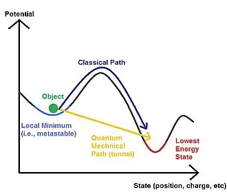 Another non-classical phenomenon predicted by quantum mechanics is quantum tunnelling: a particle that goes up against a potential barrier can cross it, even if its kinetic energy is smaller than the maximum of the potential.[11] In classical mechanics this particle would be trapped. Quantum tunnelling has several important consequences, enabling radioactive decay, nuclear fusion in stars, and applications such as scanning tunnelling microscopy, tunnel diode and tunnel field-effect transistor.[12][13]