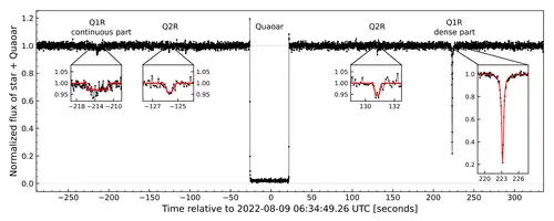 - ^ a b c d e f g h i B. E. Morgado; et al. (8 February 2023). "A dense ring of the trans-Neptunian object Quaoar outside its Roche limit". Nature. 614 (7947): 239–243. Bibcode:2023Natur.614..239M. doi:10.1038/S41586-022-05629-6. ISSN 1476-4687. PMID 36755175. Wikidata Q116754015.