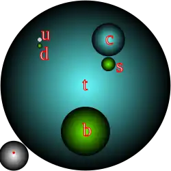Current quark masses for all six flavors in comparison, as balls of proportional volumes. Proton (gray) and electron (red) are shown in bottom left corner for scale.