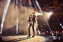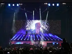On 25 and 26 April, May and Taylor appeared on the eleventh series of American Idol at the Nokia Theatre, Los Angeles, performing a Queen medley with the six finalists on the first show, and the following day performed "Somebody to Love" with the 'Queen Extravaganza' band.[288] Queen were scheduled to headline Sonisphere at Knebworth on 7 July 2012 with Adam Lambert[289] before the festival was cancelled.[290] Queen said that they were looking to find another venue.[291] Queen + Adam Lambert played two shows at the Hammersmith Apollo, London on 11 and 12 July 2012.[292][293] Both shows sold out within 24 hours of tickets going on sale.[294] A third London date was scheduled for 14 July.[295] On 30 June, Queen + Lambert performed in Kyiv, Ukraine at a joint concert with Elton John for the Elena Pinchuk ANTIAIDS Foundation.[296] Queen also performed with Lambert on 3 July 2012 at Moscow's Olympic Stadium,[297][298] and on 7 July 2012 at the Municipal Stadium in Wroclaw, Poland.[299]