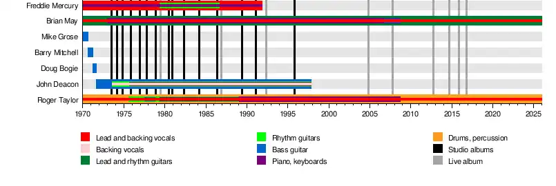 Queen are a British rock band formed in London in 1970 by Freddie Mercury (lead vocals, piano), Brian May (guitar, vocals), and Roger Taylor (drums, vocals), later joined by John Deacon (bass). Their earliest works were influenced by progressive rock, hard rock and heavy metal, but the band gradually ventured into more conventional and radio-friendly works by incorporating further styles, such as arena rock and pop rock.