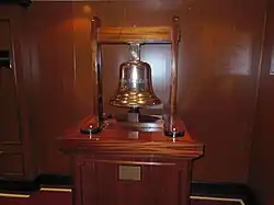 There were six crew bars, the main four were split into the Senior Rates Recreation Rooms on Deck 2 and the Junior Rates on Deck 3, with Deck and Engine Departments on the port side and Hotel on the starboard side of the ship. The Female crew recreation room was on Deck 1 next to their dedicated mess room. Over time the Deck & Engine Ratings Room became The Petty Officers Club and then the Fo'c'sle Club when the British Deck and Engine crew were changed to Filipino crew. The Hotel Senior Rates room became a crew gym. The Junior Rates Rooms on Deck 3 were the main crew bars and were called The Pig & Whistle.[33] ("The 2 deck Pig" and three deck pig, for short and a tradition aboard Cunard ships) and Castaways on the starboard side. After the expansion of female crew following the conversion to diesel power, the female-only recreation and mess room became a crew library and later the crew services office. The final bar on Deck 6 aft was small and in a former crew launderette so it was called the Dhobi Arms, a hang out for the Liverpool crew but was closed in the late '80s. A bar, dedicated for the officers, is located at the forward end of Boat Deck. Named The Officers Wardroom, this area enjoyed forward-facing views and was often opened to passengers for cocktail parties hosted by the senior officers.[34] The crew mess was situated at the forward end of One Deck,[33] adjacent to the crew services office.