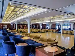 Some original elements were retained, including the flared columns in the Queen's Room and Mid-Ships Lobby. The Queen's Room's indirect ceiling lighting was replaced with uplighters which reversed the original light airy effect by illuminating the lowered ceiling and leaving shadows in the ceiling's slot.