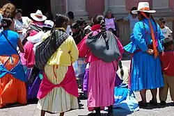 There are indigenous communities in seven of the 18 municipalities of the state, mostly Otomi and Pame. These communities are divided into three regions: South, Arid Center and Sierra Madre Oriental, with the Otomis dominating in the first two and the Pames in the last.[20] The most important indigenous group in the state is the Otomi. These people have inhabited central Mexico for over 5,000 years and were part of cities and empires such as Cuicuilco, Teotihuacan and Tula. Their language is part of the Oto-Manguean family, which includes Pame, Mazahua, Matlatzinca and the Chichimeca-Jonaz languages. They have maintained their language, which is called hñahñu, which literally means to speak with nasal sounds. However, most Otomi speakers are bilingual. Their name for themselves varies in the different areas of central Mexico where they live, but in southern part of Querétaro, they call themselves the Ñano. Otomi communities in the state have their own authorities, in addition to Mexican ones, in both the civil and religious arenas, who are elected annually. Most profess the Catholic faith, but it is influenced by indigenous beliefs. The trading of goods is still an important part of the economy of many Otomi communities, and they are known for their abilities with herbal medicines. A number who live in rural areas can still be seen in traditional dress. For women, this includes a hand-embroidered blouse and skirt, a garment called a quexquemetl and huaraches. For men, this includes shirts and pants of undyed or white cotton, tied with an embroidered belt, huaraches and a hat made with palm fronds.[25] These communities are located in south in Amealco de Bonfil. Here, over 25,000 people live in 31 communities, such as San Ildefonso, Tultepec, Santiago Mexquititlán, Chitejé de la Cruz and San Miguel Tlaxcatltepec. In the arid parts of the center of the state, indigenous communities are found in the municipalities of Tolimán, Cadereyta, Colón and Ezequiel Montes, with about 21,500 Otomis in 56 different communities.[20] In the Sierra Madre Oriental, about 3,775 people, mostly Pame with an important group of Huastecas are found in three communities in the municipalities of Jalpan de Serra and Arroyo Seco.[20] However, of all the people in these indigenous communities, only a total of 23,363 spoke an indigenous language, primarily Otomi, as of 2005. Most (94.8%) of these were also speakers of Spanish.[9][20]