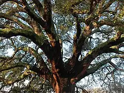 The cork oak forest is one of the major plant communities of the Mediterranean woodlands and forests ecoregion.[15] In natural populations, the cork oak grows together with the holm oaks (Quercus ilex, Quercus rotundifolia), the Portuguese oak (Quercus faginea), the Pyrenean oak (Quercus pyrenaica), Mirbeck's oak (Quercus canariensis), the maritime pine (Pinus pinaster), the stone pine (Pinus pinea), the strawberry tree (Arbutus unedo) and the olive tree (Olea europaea), in cooler locations also with the sweet chestnut (Castanea sativa). In addition to these tree species, the shrub-forming species include the Kermes oak (Quercus coccifera), the Lusitanian oak (Quercus lusitanica) the holly buckthorn (Rhamnus alaternus), species of the genus Phillyrea, the myrtle (Myrtus communis), the green heather (Erica scoparia), the common smilax (Smilax aspera) and the Montpellier cistus (Cistus monspeliensis) are often found together with the cork oak.[14]