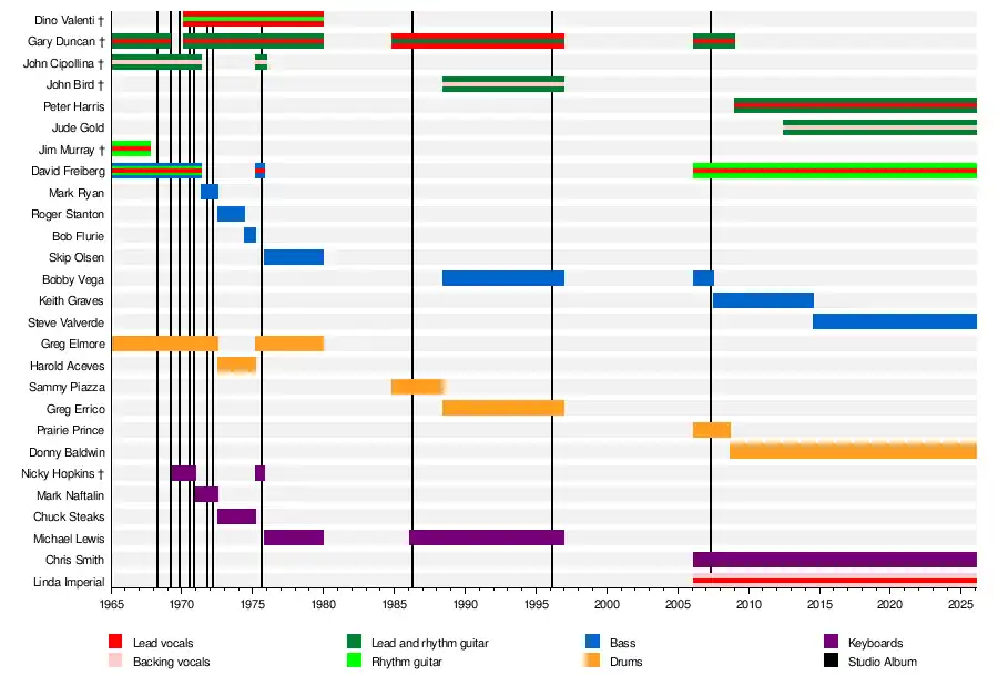 - Gary Duncan – lead and rhythm guitar, lead and backing vocals (1965–1969, 1969–1979, 1984–1996, 2006–2009; died 2019)
