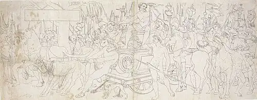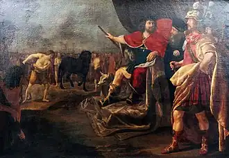 Although Appian's description of Sertorius' debauchery may be exaggerated, some sources believe Sertorius was drunk at the banquet.[164] Plutarch reports that any festivities Sertorius was invited to were apparently very proper, but this banquet was purposely indecent, "with the hope of angering Sertorius".[161] Why the assassins wanted to goad Sertorius is unclear, given an agitated man would be harder to kill than an unsuspecting one. Sertorius, either out of disgust or due to his inebriation, threw himself back on the couch he was resting on.[165] Perperna then gave the signal to the conspirators by dropping his goblet on the floor, and they attacked. Antonius slashed at Sertorius, but he turned away from the blow and would have risen if Antonius did not hold him down.[161] The others stabbed him until he was dead.