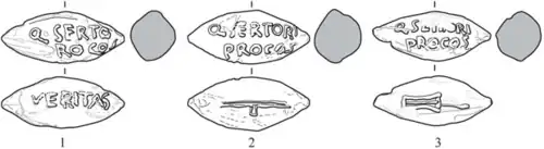 ![]() Reverse of a denarius struck during the revolt[1] of Sertorius in Osca (Bolskan), his capital city. The text reads "BOLSKAN" in Iberian characters. | |||||||||