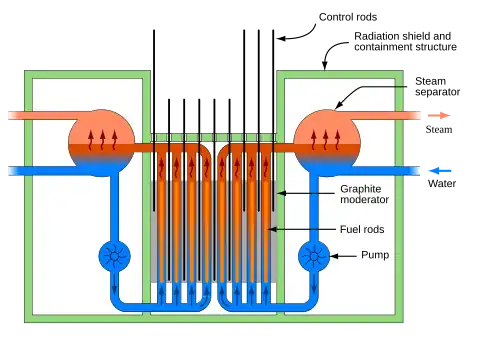 The RBMK (Russian: Реактор большой мощности канальный, РБМК; reaktor bolshoy moshchnosti kanalnyy, "high-power channel-type reactor") is a class of graphite-moderated nuclear power reactor designed and built by the Soviet Union. It is somewhat like a boiling water reactor as water boils in the pressure tubes. It is one of two power reactor types to enter serial production in the Soviet Union during the 1970s, the other being the VVER reactor.[3] The name refers to its design[3] where instead of a large steel pressure vessel surrounding the entire core, the core is surrounded by a cylindrical annular steel tank inside a concrete vault and each fuel assembly is enclosed in an individual 8 cm (inner) diameter pipe (called a "technological channel"). The channels also contain the coolant, and are surrounded by graphite.