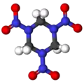 RDX (Research Department Explosive or Royal Demolition Explosive), or hexogen,[4] also known by other names, is an organic compound with the formula (CH2N2O2)3. It is white, odorless, tasteless, and widely used as an explosive.[5] Chemically, it is classified as a nitroamine alongside HMX, which is a more energetic explosive than trinitrotoluene (TNT). It was used widely in World War II and remains common in military applications. It is lower performing and more toxic than modern replacements like TKX-50.[6]