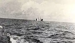 On 15 July 1918, Carpathia departed from Liverpool in a convoy bound for Boston, carrying 57 passengers (36 saloon class and 21 steerage) and 166 crew. The convoy travelled on a zig-zag course along with an escort in accordance with procedures against submarine attacks.[39] The escort left the convoy early in the morning of 17 July,[40] and the convoy was cut in half. Carpathia continued west along with six other ships, and as the largest ship in the convoy, she assumed the role of the commodore ship. Three and a half hours later, at 9:15 a.m., while sailing in the Southwest Approaches, a torpedo was sighted approaching on her port side. The engines were thrown in full-astern and the helm was turned hard-a-starboard, but it was too late to avoid the torpedo.[39] Carpathia was torpedoed near the No. 3 hatch on the port side by the Imperial German Navy submarine SM U-55, followed by a second which penetrated the engine room, killing three firemen and two trimmers, and effectively disabling her ability to escape, as the engines were rendered inoperable by the second torpedo impact.[41] The explosion severely damaged Carpathia's electrical gear, including the wireless radio apparatus, as well as two of the ship's lifeboats.[39] As a result, Captain William Prothero, in command of Carpathia since 1916, signalled the other ships in the convoy to send out wireless messages by use of flags. He then had rockets fired to attract the attention of nearby patrol boats. The remaining convoy steamed away at full speed to elude the submarine.[39]