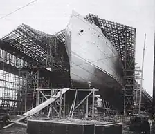RMS Carpathia was constructed by C. S. Swan & Hunter at their shipyard in Wallsend, England for the Cunard Steamship Company, to operate between Liverpool and Boston alongside Ivernia and Saxonia.[7] Her keel was laid down on 10 September 1901,[8] and she was launched on 6 August 1902, when she was christened by Miss Watson, daughter of the vice-chairman of the Cunard line.[9] She underwent her sea trials on a voyage from the River Tyne to the River Mersey between 22 and 25 April 1903.[10]