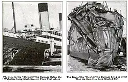 Olympic's first major mishap occurred on her fifth voyage on 20 September 1911, when she collided with the British cruiser HMS Hawke.[56] The collision took place as Olympic and Hawke were running parallel to each other through the Solent. As Olympic turned to starboard, the wide radius of her turn took the commander of Hawke by surprise, and he was unable to take sufficient avoiding action.[57] Hawke's bow, which had been designed to sink ships by ramming them, collided with Olympic's starboard side near the stern,[58] tearing two large holes in Olympic's hull, above and below the waterline, resulting in the flooding of two of her watertight compartments and a twisted propeller shaft. Olympic settled slightly by the stern,[59] but in spite of the damage was able to return to Southampton under her own power; no one was killed or seriously injured. HMS Hawke suffered severe damage to her bow and nearly capsized;[30][60] Hawke was repaired, but sunk by the German U-boat SM U-9 in October 1914.