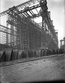 Construction of Olympic began three months before Titanic to ease pressures on the shipyard. Several years would pass before Britannic would be launched. To accommodate the construction of the class, Harland and Wolff upgraded their facility in Belfast; the most dramatic change was the combining of three slipways into two larger ones. Olympic and Titanic were constructed side by side.[16] Olympic's keel was laid on 16 December 1908 and she was launched on 20 October 1910, without having been christened beforehand.[8] By tradition, the White Star Line never christened any of their vessels and for the launch the hull was painted in a light grey colour for photographic purposes; a common practice of the day for the first ship in a new class, as it made the lines of the ship clearer in the black-and-white photographs.[20] The launch was filmed both in black and white and in Kinemacolor, with only the black and white footage surviving.[21][22] The launches of Titanic and Britannic were also filmed, though only Britannic's survived.[23] Her hull was repainted black following the launch.[6]