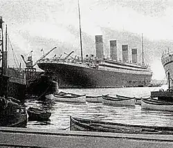 Following completion, Olympic started her sea trials on 29 May 1911 during which her manoeuvrability, compass, and wireless telegraphy were tested. No speed test was carried out.[44] She completed her sea trial successfully. Olympic then left Belfast bound for Liverpool, her port of registration, on 31 May 1911. As a publicity stunt the White Star Line timed the start of this first voyage to coincide with the launch of Titanic. After spending a day in Liverpool, open to the public, Olympic sailed to Southampton, where she arrived on 3 June, to be made ready for her maiden voyage.[45][46][47] Her arrival generated enthusiasm from her crew and newspapers.[48] The deep-water dock at Southampton, then known as the "White Star Dock" had been specially constructed to accommodate the new Olympic-class liners, and had opened in 1911.[49]