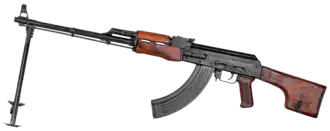 The RPK light machine gun chambered in 7.62×39mm cartridge, is essentially a Russian equivalent to a squad automatic weapon. It was adopted by the former Soviet Union, and was issued mainly to motorized units. It was later adopted by several military agencies around the world.[7]