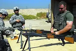 A Triple Canopy contractor gives a marksmanship class on the Zastava M-72 machine gun to two US Army soldiers.