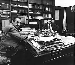 Illia was invited in 1975 to a diplomatic mission to the Soviet Union; he declined and proposed Alfonsín instead. Upon his return, Alfonsín became one of the founding members of the Permanent Assembly for Human Rights. He served as the defense lawyer for Mario Roberto Santucho, leader of the ERP guerrillas, but only to carry out due process of law, and not because of a genuine desire to support him.[10] The 1976 Argentine coup d'état against President Isabel Perón started the National Reorganization Process. Alfonsín filed several Habeas corpus motions, requesting the freedom of victims of forced disappearances. The UCR stayed silent over the disappearances, but Alfonsín urged the party to protest the kidnapping of senators Hipólito Yrigoyen (nephew of the former president of the same name) and Mario Anaya.[11] He also visited other countries, denouncing those disappearances and violations of human rights. He established the magazine Propuesta y control in 1976, one of the few magazines that criticized the military dictatorship during its early stages. The magazine was published up to 1978. His editorials were collected in 1980 in the book La cuestión argentina.