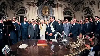 Three days after taking office, Alfonsín sent a bill to Congress to revoke the self-amnesty law established by the military. This made it possible for the judiciary to investigate the crimes committed during the Dirty War.[23] During the campaign, Alfonsín had promised that he would do this while Luder had been non-committal.[24] Alfonsín also ordered the initiation of judicial cases against guerrilla leaders Mario Firmenich, Fernando Vaca Narvaja, Ricardo Obregón Cano, Rodolfo Galimberti, Roberto Perdía, Héctor Pardo and Enrique Gorriarán Merlo; and military leaders Jorge Videla, Emilio Massera, Orlando Agosti, Roberto Viola, Armando Lambruschini, Omar Graffigna, Leopoldo Galtieri, Jorge Anaya and Basilio Lami Dozo.[23] He also requested the extradition of guerrilla leaders who were living abroad.[25]