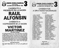Alfonsín disputed the leadership of the UCR with Carlos Contín, but was unable to pass through the complex internal regulations of the party. He made a new political rally at the Luna Park, with a success comparable to a United States presidential primary. This new rally convinced Contín, who also ambitioned to be president, that he had no chances fighting against Alfonsín in proper primary elections. Fernando de la Rúa, who would have run in the primary elections against him, declined his candidacy because of Alfonsín's huge popularity.[16] Antonio Trocolli, another precandidate, declined to run as well.[14] Alfonsín was then appointed candidate of the UCR for the 1983 general elections, with Víctor Martínez as the candidate for the vice-presidency. The UCR proposed Alfonsín to run with De la Rúa as the candidate for the vice-presidency, to secure the conservative votes, but Alfonsín was confident to win the elections without help.[17]