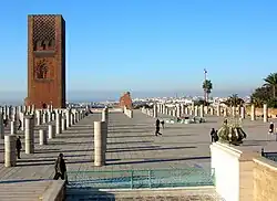The Almohad caliph Abu Yusuf Ya'qub al-Mansur (r. 1184–1199) embarked on an ambitious project to construct a new fortified imperial capital, called al-Mahdiyya or Ribat al-Fath, on the site of what is now the medina (old city) of Rabat, with new walls extending over a vast area beyond the kasbah.[20][23] This project also included the construction of an enormous mosque (the remains of which include the Hassan Tower) and of new grand gateways such as Bab er-Rouah and the main gate of the kasbah, now known as Bab Udaya or Bab al-Kbir. After al-Mansur's death in 1199 the mosque and the capital remained unfinished and his successors lacked the resources or the will to finish it.[20] The new city was never fully inhabited and the site was practically abandoned.[24][21]