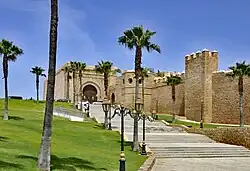 One of the last Almoravid emirs, Tashfin ibn Ali (r. 1143–1145) built a new ribat on the site of the current kasbah as part of his efforts to hold back the Almohads.[17][20] Almohads nonetheless defeated the Almoravids and destroyed the ribat shortly after.[21] In 1150 or 1151 the Almohad caliph Abd al-Mu'min built a new kasbah (citadel) to replace the former ribat, within which he included a palace and a mosque.[21][22][20] This Almohad kasbah corresponds to the current Kasbah of the Udayas (which was expanded in later periods).[20] Abd al-Mu'min also had an underground canal dug to divert a water source to this location, allowing for future settlement and urbanization in the area.[20] The site became a military staging ground for Almohad armies setting out on campaigns to Al-Andalus.[21]