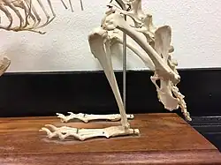 The anatomy of rabbits' hind limbs is structurally similar to that of other land mammals and contributes to their specialized form of locomotion. The bones of the hind limbs consist of long bones (the femur, tibia, fibula, and phalanges) as well as short bones (the tarsals). These bones are created through endochondral ossification during fetal development. Like most land mammals, the round head of the femur articulates with the acetabulum of the os coxae, the hip bone. The femur articulates with the tibia, but not the fibula, which is fused to the tibia. The tibia and fibula articulate with the tarsals of the pes, commonly called the foot. The hind limbs of the rabbit are longer than the front limbs. This allows them to produce their hopping form of locomotion. Longer hind limbs are more capable of producing faster speeds. Hares, which have longer legs than cottontail rabbits, are able to move considerably faster.[56] The hind feet have four long toes that allow for digitigrade movement, which are webbed to prevent them from spreading when hopping.[57] Rabbits do not have paw pads on their feet like most other animals that use digitigrade locomotion. Instead, they have coarse, compressed hair that offers protection.[58]