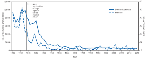 High public awareness of the virus, efforts at vaccination of domestic animals and curtailment of feral populations, and availability of postexposure prophylaxis have made rabies very rare in humans in the United States. From 1960 to 2018, a total of 125 such cases were reported in the United States; of them, 36 (28%) were attributed to dog bites suffered during international travel.[121] Among the 89 infections acquired in the United States, 62 (70%) were attributed to bats.[121]