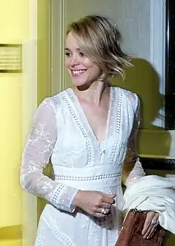 McAdams's break-out role came in 2004, when she starred in the comedy film Mean Girls opposite Lindsay Lohan, Lacey Chabert, and Amanda Seyfried, based on Rosalind Wiseman's book Queen Bees and Wannabes. McAdams was 24 years old when she was cast as the mean high school queen bee Regina George, and she modelled her character on Alec Baldwin's performance in the drama Glengarry Glen Ross (1992).[38][39] Mike Clark of USA Today praised her "comic flair"[40] while Jenny McCartney of The Daily Telegraph found her "delightfully hateful."[41] Mick LaSalle of the San Francisco Chronicle felt that "McAdams brings glamour and magnetism to Regina, but also the right hint of comic distance."[42] The film grossed $129 million worldwide[43] and earned McAdams two MTV Movie Awards.[44] Mean Girls later reached No. 12 in an Entertainment Weekly list of the Greatest Ever High School Movies.[45] Tina Fey, who co‑starred in the film and wrote the screenplay, has credited McAdams with teaching her how to act in front of a camera rather than an audience: "She's a film actor. She's not pushing. And so I kind of learned that lesson from watching her."[46]