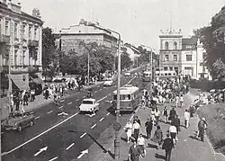 After the Third Partition of Poland (1795), Radom was part of the Austrian province of West Galicia. After the Polish victory in the Austro-Polish War of 1809, it was part of the Polish Duchy of Warsaw, which named it capital of the Radom Department. From 1815 the city belonged to Russian-controlled Congress Poland, remaining a regional administrative center. In 1816–1837 it was the capital of the Sandomierz Voivodeship, whose capital, despite the name, was at Radom. In 1837–1844 it was the capital of the Sandomierz Governorate, and from 1844 until the outbreak of World War I, the capital of the Radom Governorate. The Polish 5th Line Infantry Regiment, which later fought against Russia in the November Uprising, was stationed in Radom.[12] The city was an important center of the November Uprising. Its obsolete and ruined fortifications were destroyed upon order of Mayor Józef Królikowski. In the early days of the January Uprising, Marian Langiewicz visited Radom, preparing the rebellion. In the 19th century, Radom was one of the leading centers of the new art of photography in partitioned Poland, alongside major cities of Warsaw, Gdańsk, Kraków and Wilno.[13] In 1867 a sewage system was built. Russians closed down the Benedictine monastery and established a Tsarist prison in its place.[14] Streets were gradually paved, and in 1885, a rail line from Dąbrowa Górnicza to Dęblin was completed, via Radom. In the early 20th century a power plant was built. In 1906, notable Polish independence fighter Kazimierz Sosnkowski, future politician and general, escaped from Warsaw to Radom, pursued by the Russian Okhrana.[15] In Radom, he continued his secret activities, and became the commander of the local Combat Organization, before he eventually had to escape again, this time to the Dąbrowa Basin.[15]
