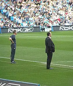 Liverpool made a good start to the 2007–08 season, topping the Premier League table for the first time under Benítez, after a comprehensive 6–0 win over Derby County. Despite this, poor results in the Champions League and a disagreement over future transfers lead to a public falling-out with the club's owners, which played out in the media at the end of November. It was suggested that Benítez's position was now under serious threat. The resulting coverage resulted in a show of support by fans in support of Benítez which culminated in a fans' march in support of Benítez ahead of the critical Champions League home tie with Porto, which they won 4–1.[31] It later emerged that Jürgen Klinsmann had been offered Benítez's job before eventually accepting the post of Bayern Munich manager. Such a revelation damaged Benítez's relations with the Americans, with constant rumours linking the Spaniard with a move back to Real Madrid.[32] Benítez, however, said that his future was at Liverpool and appointed Sammy Lee as his new assistant[33] to replace his long-time right-hand man, Pako Ayestarán, who quit after a reported disagreement.[34]