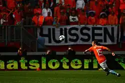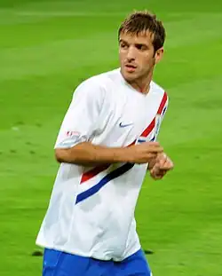 Despite enduring a tough time at club level,[78] Van der Vaart remained a first-choice player for Van Basten's successor Bert van Marwijk in the 2010 World Cup qualifiers. On 10 September 2008, he ended a ten-month goal drought with a vital strike against Macedonia in a 2–1 win.[79] He ended the campaign with 2 goals and several important assists. On 12 August 2009, Van der Vaart captained the Dutch in the absence of Giovanni van Bronckhorst in a friendly against England. He scored the second goal off a Gareth Barry mistake to put the Netherlands two goals up in the first half but Jermain Defoe netted a brace to seal a 2–2 draw.[80] Van der Vaart was in the starting line-up for the three group matches in the 2010 World Cup, against Denmark,[81][82] Japan[83] and Cameroon,[84] but eventually lost his spot in the starting line-up to his recently recovered fellow midfielder Arjen Robben after being substituted in the match against Cameroon.[85] He was brought off the pitch after giving away a penalty to Cameroon by blocking the ball with his arm from a free-kick.[86] However, he made another appearance in the semi-final against Uruguay, after coming on for the injured Demy de Zeeuw.[87] He helped Oranje win the match 3–2, thus sending them to the final.[88] He also played in the final against Spain, substituting Nigel de Jong just before injury time. Netherlands lost the game 1–0 to a goal from Andrés Iniesta.[89] He was handed the captain's armband during the match, after Giovanni van Bronckhorst was substituted off.[90]