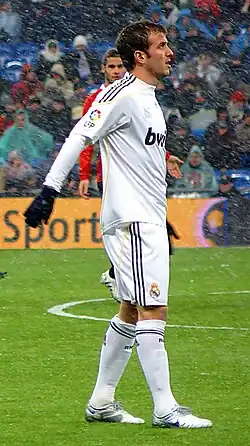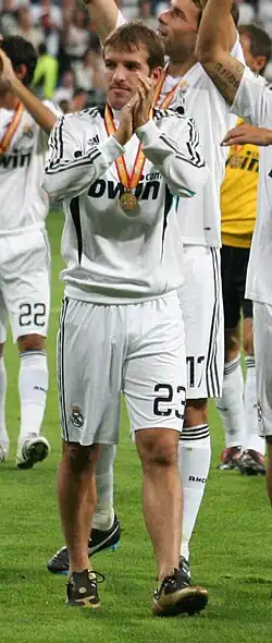 He changed his squad number from 19 to his favoured number 23 after teammate Wesley Sneijder took number 10 following Robinho's departure to Manchester City on 31 August.[26] He marked his league debut for Real Madrid with a strike against Numancia in a 4–3 victory. On 24 September, he scored his first career hat-trick in a 7–1 thrashing of Sporting de Gijón.[27] In October 2008, Van der Vaart was one of the many La Liga players to be nominated for the Ballon d'Or, but the award eventually went to Manchester United forward and future teammate Cristiano Ronaldo.[28] For the latter part of the 2008–09 season, Van der Vaart was mostly utilised as an impact substitute by coach Juande Ramos, which led to speculations of a fall-out between coach and player. Despite transfer rumours linking him with Arsenal, Chelsea and Liverpool, he denied having any links with the English clubs.[29]