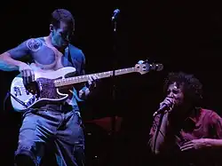 ![]() Rage Against the Machine at Sam Boyd Stadium in 2007. From left: Tim Commerford, Zack de la Rocha, Brad Wilk, and Tom Morello | |