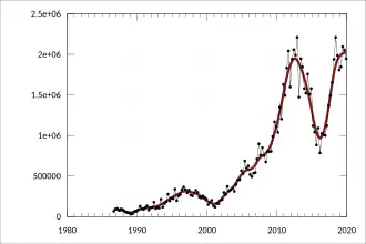 Rail transport in Australia is a component of the Australian transport system. It is to a large extent state-based, as each state largely has its own operations, with the interstate network being developed ever since Australia's federation in 1901. As of 2022, the Australian rail network consists of a total of 32,929 kilometres (20,461 mi) of track built to three major track gauges: 18,007 kilometres (11,189 mi) of standard gauge (1435 mm / 4 ft 81⁄2 in), 2,685 kilometres (1,668 mi) of broad gauge (1600 mm / 5 ft 3 in), and 11,914 kilometres (7,403 mi) of narrow gauge (1067 mm / 3 ft 6 in) lines.[1] Additionally, about 1,400 kilometres (870 mi) of 610 mm / 2 ft gauge lines support the sugar-cane industry.[2] 3,488 kilometres (2,167 mi), around 11 percent of the Australian heavy railways network route-kilometres are electrified.[1]