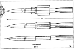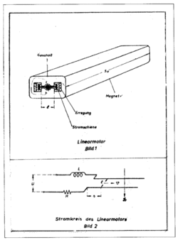 In 1944, during World War II, Joachim Hänsler of Germany's Ordnance Office proposed the first theoretically viable railgun.[13][17] By late 1944, the theory behind his electric anti-aircraft gun had been worked out sufficiently to allow the Luftwaffe's Flak Command to issue a specification, which demanded a muzzle velocity of 2,000 m/s (4,500 mph; 7,200 km/h; 6,600 ft/s) and a projectile containing 0.5 kg (1.1 lb) of explosive. The guns were to be mounted in batteries of six firing twelve rounds per minute, and it was to fit existing 12.8 cm FlaK 40 mounts. It was never built. When details were discovered after the war it aroused much interest and a more detailed study was done, culminating with a 1947 report which concluded that it was theoretically feasible, but that each gun would need enough power to illuminate half of Chicago.[15]