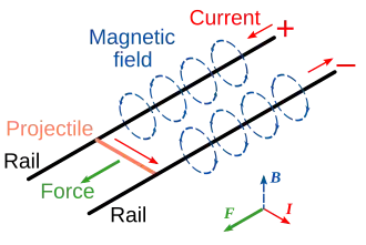 The railgun in its simplest form differs from a traditional electric motor[5] in that no use is made of additional field windings (or permanent magnets). This basic configuration is formed by a single loop of current and thus requires high currents (on the order of one million amperes) to produce sufficient accelerations (and muzzle velocities). A relatively common variant of this configuration is the augmented railgun in which the driving current is channeled through additional pairs of parallel conductors, arranged to increase ('augment') the magnetic field experienced by the moving armature.[6] These arrangements reduce the current required for a given acceleration. In electric motor terminology, augmented railguns are usually series-wound configurations. Some railguns also use strong neodymium magnets with the field perpendicular to the current flow to increase the force on the projectile.[7]