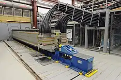 In 1980, the Ballistic Research Laboratory (later consolidated to form the U.S. Army Research Laboratory) began a long-term program of theoretical and experimental research on railguns. The work was conducted predominantly at the Aberdeen Proving Ground, and much of the early research drew inspiration from the railgun experiments performed by the Australian National University.[20][21] Topics of research included plasma dynamics,[22] electromagnetic fields,[23] telemetry,[24] and current and heat transport.[25] While military research into railgun technology in the United States ensued continuously in the following decades, the direction and focus that it took shifted dramatically with major changes in funding levels and the needs of different government agencies. In 1984, the formation of the Strategic Defense Initiative Organization caused research goals to shift toward establishing a constellation of satellites to intercept intercontinental ballistic missiles. As a result, the U.S. military focused on developing small guided projectiles that could withstand the high-G launch from ultra-high velocity plasma armature railguns. But after the publication of an important Defense Science Board study in 1985, the U.S. Army, Marine Corps, and DARPA were assigned to develop anti-armor, electromagnetic launch technologies for mobile ground combat vehicles.[26] In 1990, the U.S. Army collaborated with the University of Texas at Austin to establish the Institute for Advanced Technology (IAT), which focused on research involving solid and hybrid armatures, rail-armature interactions, and electromagnetic launcher materials.[27] The facility became the Army's first Federally Funded Research and Development Center and housed a few of the Army's electromagnetic launchers, such as the Medium Caliber Launcher.[26][28]