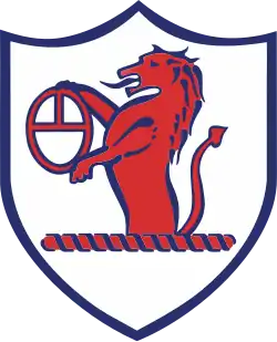 Raith's kit consists of dark blue tops with light blue detailing, with white shorts and dark blue socks.[23] Raith's current badge has been used since 1998,[24] replacing the previous lion and shield motif used in different colour combinations (including being framed in a shield shape from 1995 to 1998) since 1985.[24]