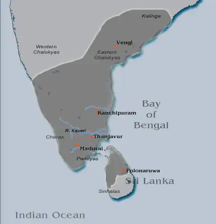 The Cholas controlled the area around Bay of Bengal with Nagapattinam as the main port. The Chola Navy also played a major role in the invasion of Sri Lanka.[50] The success of Rajaraja allowed his son Rajendra Chola to lead the Chola invasion of Srivijaya, carrying out naval raids in South-East Asia and briefly occupying Kadaram.[5][51]