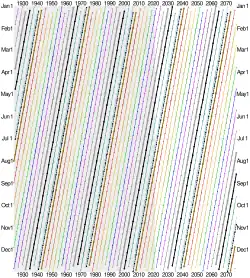 Conversion of Hijri years 1343 to 1500 to the Gregorian calendar, with first days of al-Muharram (brown), Ramadan (grey) and Shawwal (black) bolded, and Eid al-Adha dotted – in the SVG file, hover over a spot to show its dates and a line to show the month