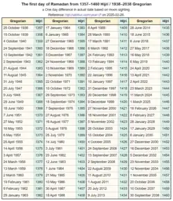 Ramadan beginning dates between Gregorian years 1938 and 2038.