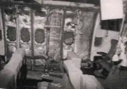 United States Diplomatic Security Service photograph showing the damaged interior of PAL 434 after the bombing. The explosion punched a hole, visible in the lower center of the photo, through the floor below seat 26K into the center cargo bay.