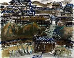 Ran was Kurosawa's last epic film and by far his most expensive. At the time, its budget of $11–12 million made it the most expensive Japanese film in history, leading to its distribution in 1985 exceeding the budget of $7.5 million for his previous film Kagemusha.[2][3][4] It is a Japanese-French venture[1] produced by Herald Ace, Nippon Herald Films, and Greenwich Film Productions. Filming started in 1983.[5] The 1,400 uniforms and suits of armor used for the extras were designed by costume designer Emi Wada and Kurosawa, and were handmade by master tailors over more than two years. The film also used 200 horses. Kurosawa loved filming in lush and expansive locations, and most of Ran was shot amidst the mountains and plains of Mount Aso, Japan's largest active volcano. Kurosawa was granted permission to shoot at two of the country's most famous landmarks, the ancient castles at Kumamoto and Himeji. For the castle of Lady Sue's family, he used the ruins of the custom-constructed Azusa castle, made by Kurosawa's production crew near Mount Fuji.[6][7][8] Hidetora's third castle, which was burned to the ground, was a real building which Kurosawa built on the slopes of Mount Fuji. No miniatures were used for that segment, and Tatsuya Nakadai had to do the scene where Hidetora flees the castle in one take.[6] Kurosawa also filmed a scene that required an entire field to be sprayed gold, but cut it out of the final film during editing. The documentary A.K. shows the filming of the scene.