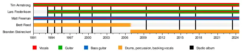 Rancid has had two lineup changes since its inception, with Tim Armstrong and Matt Freeman being continuous members. Their current lineup consists of Armstrong on guitar and vocals, Freeman on bass and vocals, Lars Frederiksen on guitar and vocals, and Branden Steineckert on drums. The band was formed by Armstrong, Freeman, and former drummer Brett Reed, who left the band in 2006 and was replaced by Steineckert. This lineup recorded their first album, with Frederiksen joining the band on their subsequent tour.