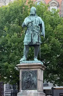 Randers was formally established around the 12th century, but traces of activity date back to Viking times.[7] Canute IV of Denmark (ca. 1043–1086), also known as Canute the Saint and Canute the Holy, and as patron saint of Denmark, minted coins in the town.[8] He had plans to attack England and its ruler, William the Conqueror, He assembled people in this town. A chronicle written at Essenbæk Abbey tells of a fire that ravaged the city. The city was destroyed and rebuilt three times in the 13th century. In 1246, it was burned down by Abel of Denmark's troops during the civil uprising against Eric IV of Denmark. On a street in the town center is the house where, according to legend, Danish nobleman and national hero Niels Ebbesen killed Count Richard (Gerhard) III of Holstein on 1 April 1340, during the Kingless Times, when the entire country was pledged to German counts. This action led to further insurrection against the Germans. Ebbesen died in a large battle at Skanderborg Castle in December 1340.[9] A statue to Ebbesen stands in front of Randers's Town Hall today.