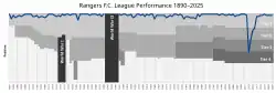 One of the eleven original members of the Scottish Football League,[11] Rangers remained in the top division continuously until a financial crisis during the 2011–12 season saw the club enter administration[12] and the original company liquidated[13][14] with the assets moved to a new company structure.[15] The club was accepted as an associate member of the Scottish Football League and placed in the fourth tier of the Scottish football league system in time for the start of the following season. Rangers then won three promotions in four years, returning to the Premiership for the start of the 2016–17 season; in their climb through the Scottish lower divisions, Rangers became the only club in Scotland to have won every domestic trophy. In 2020–21 Rangers won their first Scottish championship in ten years, a then world record fifty-fifth league win which also stopped rivals Celtic's quest to break the domestic record of ten titles in a row.