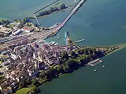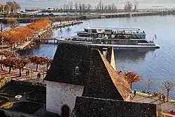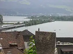 During summer, there is a ferry across Obersee.[24] The ferry connects a pier near the University of Applied Sciences Rapperswil (now part of OST), just south of Rapperswil railway station, with Lachen and Altendorf in the canton of Schwyz.